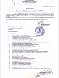 In 2024, on July 16 and 17, the federal administration has announced a two-day vacation to commemorate Ashura, which falls on the ninth and tenth of Muharram.”The Prime Minister is pleased to declare 16th and 17th July 2024 (Tuesday and Wednesday) as public holidays on the occasion of Ashura (9th & 10th Moharram 1446 AH),” the Cabinet Division said in a notification on Tuesday.
