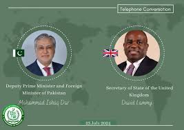 Islamabad, JULY23: The Deputy Prime Minister and Foreign Minister, Senator Ishaq Dar, held a telephone conversation with David Lammy, the newly elected Secretary of State for Foreign Affairs, Commonwealth and Development Affairs of the United Kingdom.